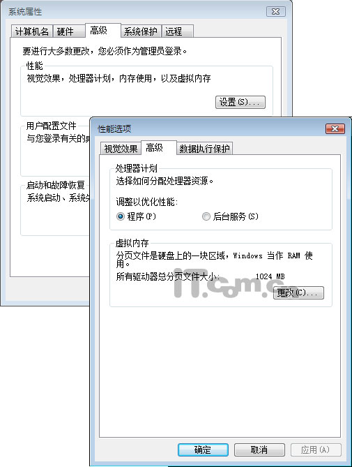 登录Vista系统,右键点击桌面上的“计算机”图标来选择“属性”项,在打开的属性窗口点击左侧的“高级系统设置”,这时会打开“系统属性”窗口,点击“高级”标签,再点击“性能”选项下的“设置”按钮,接着在弹出的窗口中点击“虚拟内存”下的“更改”按钮(如图1)。