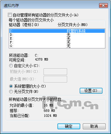 在弹出的“虚拟内存”窗口中把“自动管理所有驱动器的分页文件大小”前面的勾去掉,再选中Vista系统所在的分区,接着选中下面的“无分页文件”,再点击“设置”按钮。然后选中“C盘”后,再选中“系统管理的大小”,点击“设置”按钮,这样就可以把Vista的虚拟内存设置到Windows XP安装分区中了(如图2)。