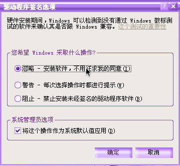选择“硬件”选项卡,然后单击“驱动程序”中的“驱动程序签名”(见图1)按钮,在弹出的对话框中选择“忽略-安装软件,不用征求我的同意(I)”(如图2),这时应注意把“系统管理员选项”下的“将这个操作作为系统默认值应用(D)”前的复选框也选中,最后单击“确认”按钮退出即可,以后再安装设备驱动程序就会畅通无阻了。
