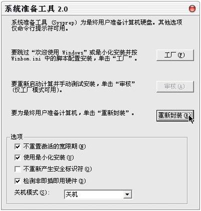 把Windows安装光盘插入到光驱中,并打开光盘SUPPORTTOOLS文件夹,双击DEPLOY.CAB文件,把其中的所有文件解压到一文件夹下(如C:Sysprep),双击其中的sysprep.exe文件,并按下“确定”按钮接受警告信息。并选中窗口中“不重置激活的宽限期”、“使用最小化安装”和“检测非即插即用硬件”复选框。按下“重新封闭”按钮,机器会自动关闭。