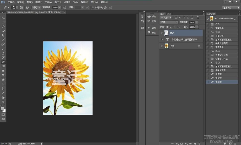 点击橡皮擦工具,然后再点击(童话)大字的图层.(这里会蹦出来一个对话框,说要栅格化图层,点确定就行了) 然后再按住Shift键擦掉小字那块地方.(这里点击的是大字图层,所以不会擦掉小字).