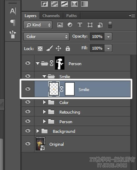 使用移动工具将头像移到合适的位置,并调整其大小。改变图层的叠加模式为Color