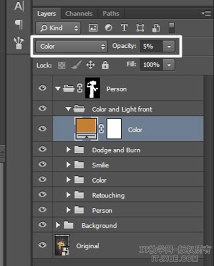 非常重要的一点就是人物和背景必须融为一体。所以我们把这图层的叠加模式改为”Color”,并且不透明度改为5%。