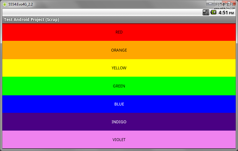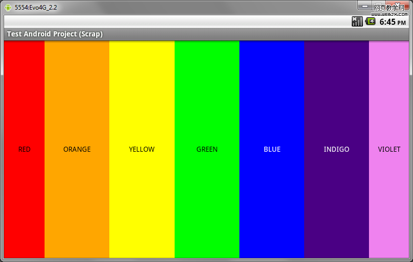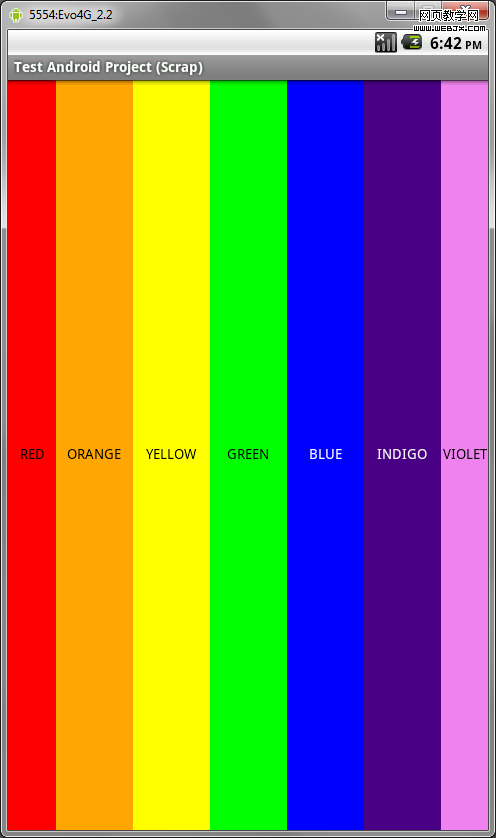 当屏幕上有足够空间来正确的展示所有控件的时候,这个权值技巧很有效。那就是说,当空间很紧的时候,权值属性可能会被其它因素覆盖,比如视图裁剪或者在TextView下试图不环绕文本。当我们改变rainbow.xml布局文件以包含相似水平布局(layout_height 还是设置为 fill_parent)的时候,这变得很明显。