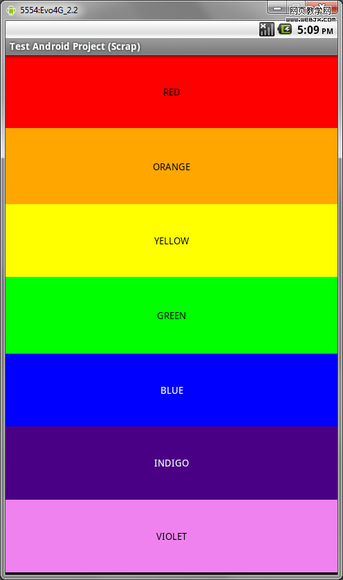 <?xml version="1.0" encoding="utf-8"?> <LinearLayout xmlns:android="http://schemas.android.com/apk/res/android" android:layout_width="fill_parent" android:layout_height="fill_parent" android:orientation="vertical"> <TextView android:text="RED" android:id="@+id/TextView01" android:layout_height="wrap_content" android:background="#f00" android:layout_width="fill_parent" android:layout_weight=".14" android:gravity="center" android:textColor="#000"></TextView> <TextView android:text="ORANGE" android:id="@+id/TextView02" android:layout_height="wrap_content" android:layout_width="fill_parent" android:layout_weight=".15" android:background="#ffa500" android:gravity="center" android:textColor="#000"></TextView> <TextView android:text="YELLOW" android:id="@+id/TextView03" android:layout_height="wrap_content" android:layout_width="fill_parent" android:layout_weight=".14" android:background="#ffff00" android:gravity="center" android:textColor="#000"></TextView> <TextView android:text="GREEN" android:id="@+id/TextView04" android:layout_height="wrap_content" android:layout_width="fill_parent" android:layout_weight=".15" android:background="#0f0" android:gravity="center" android:textColor="#000"></TextView> <TextView android:text="BLUE" android:id="@+id/TextView05" android:layout_height="wrap_content" android:layout_width="fill_parent" android:layout_weight=".14" android:background="#00f" android:gravity="center" android:textColor="#fff"></TextView> <TextView android:text="INDIGO" android:id="@+id/TextView06" android:layout_height="wrap_content" android:layout_width="fill_parent" android:layout_weight=".14" android:background="#4b0082" android:gravity="center" android:textColor="#fff"></TextView> <TextView android:text="VIOLET" android:id="@+id/TextView07" android:layout_height="wrap_content" android:layout_width="fill_parent" android:layout_weight=".14" android:background="#ee82ee" android:gravity="center" android:textColor="#000"></TextView> </LinearLayout>