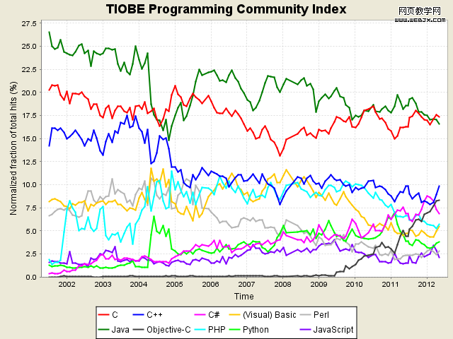 Java 自从上个月丢掉第一个的宝座以后,这个月的的走势依然下挫。在过去8年中,前10名的编程语言几乎没有变化,只是 Objective-C 把 Delphi 给挤了出去。人们对新语言的接受程度进展缓慢,这很有可能是由于遗留系统难以迁移导致的。及时把这个因素考虑进去,也没有任何新的语言表现出持续上升的势态。