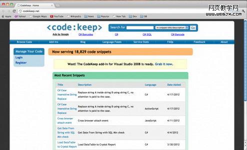 由于用户几乎每天提供大量代码,Code Keep已经成为一个很受开发者欢迎的网站。此网站提供的代码包含了C、C++、VB等编程语言。