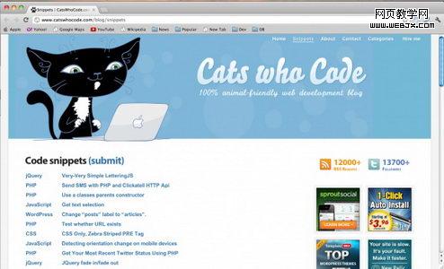 Cats Who Code网站主要为网站开发者、网页设计师、网站管理员等提供相应的代码段。此网站目标是通过提供高质量的源代码和教程,使得网站开发变得简便、有趣。