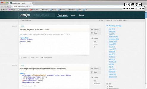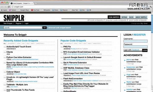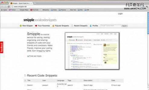 Snipplr是一个庞大的代码资源库,用户可以在世界上任何一台联网的电脑上访问自己的代码库,同时,也可以和他人共享自己的代码库。