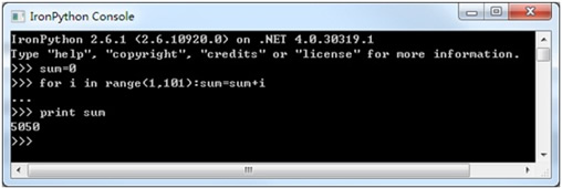 举个简单的例子,图 2所示为使用IronPython[2]编程计算“1+2+……+100”的屏幕截图,我们可以快速地输入一段完成累加求和的代码,然后马上就可以看到结果: