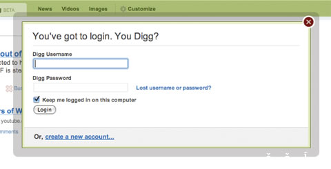 Digg 的登录窗口有一个厚厚的阴影围绕它来屏蔽网页噪音。