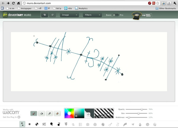 DeviantArt 是一个著名的,汇集了大量怪诞艺术家的非主流艺术作品展示网站,最近,他们推出了一个完全基于 HTML5 的绘图程序 Muro。这个几乎支持所有现 代浏览器,无需 Flash 和任何插件的绘图工具是作者见过的最好的HTML5 绘图程序。该程序甚至支持 Wacom 手写绘图板。