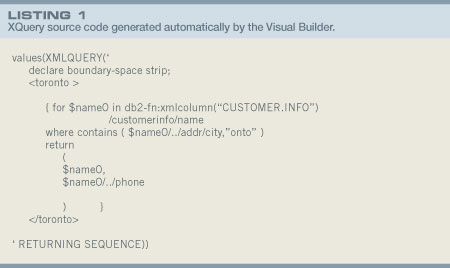 现在轮到了我认为是 Visual Builder 最好的一个特性。回到网格上,选择左上角的 Source 标签页。您将看到自动生成的描述查询的 XQuery 代码。该代码的主体可以直接在数据库查询或存储过程中使用,这对于动态构建 XML 查询是一种快速有效的方法。我们的例子生成了如清单 1 所示的源代码。