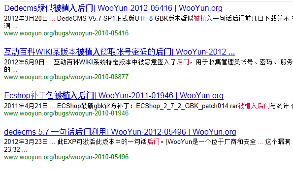 图:漏洞提交网站wooyun上近期公布的被植入后门的web应用列表