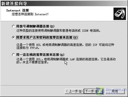 Step5:此时根据用户小区宽带的接入类型来选择Internet的连接方式,如网通用户直接使用本机拨号,则选择“用要求用户名和密码的宽带连接来连接”方式(如图3)。
