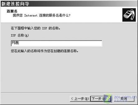 Step6:接着设定宽带ISP服务连接的名称,如网通用户可选用服务商的名称来取名(如图4)。这个名称只起到标识作用,对连接没有决定性的影响。