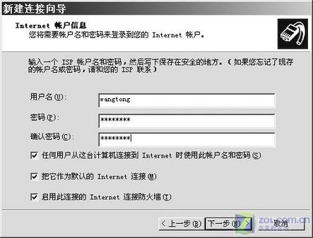 Step7:最后输入用户登录网络的用户名和密码(如图5),该信息往往是由你选择的接入服务商(如电信网通等)提供的。在下方有三个安全选项,对一般用户来说,可以将它们全部选中即可。完成后向导会提示在桌面上建立一个快捷方式,这样我们下次连接时就可以直接双击快捷方式进行了。