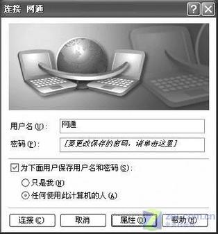 Step8:建立完成后在桌面上点击,连接快捷方式就会弹出连接对话框(如图6),此时用户名和密码已经填好,只需直接点击连接按钮即可。如果有多人同时使用计算机,而你又不希望他们使用你的账号上网,你可以取消“为下面用户保留用户名和密码”选项前的钩,每次连接时手动如入密码和用户名即可。