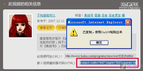 首先,在土豆网随便找到到你喜欢的一个视频,具体在这里就不介绍了。在视频播放的下方复制“嵌入视频播放器代码(HTML)”,之后回弹出一个对话框,提示已复制。