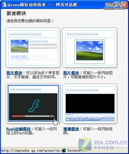 然后就是把视频放到QQ空间里了。进入自己的QQ空间以后选择“自定义”—“新建模块”。选择新建“flash动画模块”。