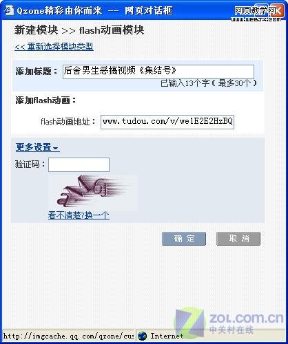 加好标题以后,在下面的flash动画地址中把刚才找到的视频地址复制进去。填好验证码以后,点击确定提交。