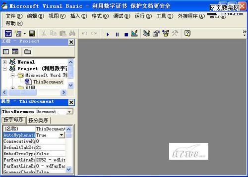 这里你要打开包含要宏签名的文件,在依次单击上方“工具→宏→Visual Basic编辑器→工程资源管理器”选项,此时就会弹出“Microsoft Visual Basic”对话框(如图1)。