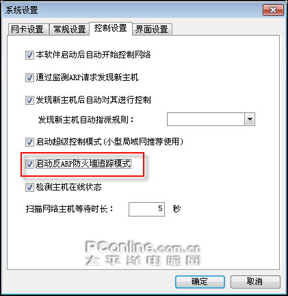 在“控制设置”中建议勾选启动后自动开启控制网络 及发现新主机自动对其进行控制(防止新接入主机不受控制),为了避免被其它人安装的ARP防火墙探测到你正在使用P2P终结者,可以勾选“启用反ARP防护墙追踪模式”,启用该选项后,对方ARP防火墙将无法发现ARP攻击IP地址,但是依然能够顺利的阻挡P2P终结者的控制。