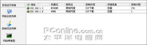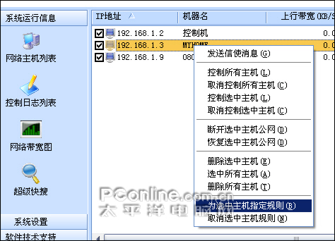 编辑好规则后,只需要切换回“系统运行信息→网络主机列表”找到需要控制的主机,点击鼠标右键,在右键菜单中选择“为选中主机制定规则”,然后选择一个需要应用到该主机的规则,就可以用设定的规则在制定的时间段来控制该主机的联网活动了。如果你发现对某个主机没有成功的进行限制,一是没有没有勾选在“网络主机列表”里对应的主机,一是没有点击“启动控制”按钮,再者就是对方使用了ARP防火墙。(说起ARP防火墙,笔者特定测试了一下新版P2P终结者能否控制安装使用了ARP防火墙的主机,测试结果依然是控制失败。对于安装了ARP防火墙的主机,新版P2P终结者依然无能为力。)