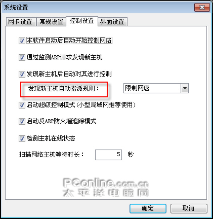 当局域网中有新主机添加进来时,你可以让P2P终结者自动将控制规则应用到新加入主机中。具体操作“系统设置→高级选项→控制设置→发现新主机自动指派规则”。