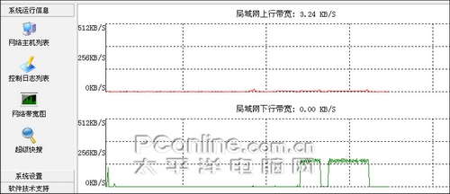 P2P终结者有日志功能,用户可根据日志来查看局域网用户所触犯的拦截规则。还有一个“网络带宽图”,以曲线图的形式向你报告网络流量。