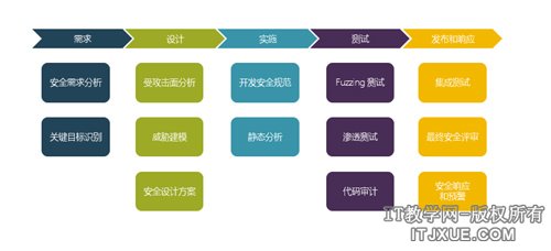 SDL从需求阶段、设计阶段、实施阶段、测试阶段和发布响应阶段来引入安全管理。SDL的各个阶段相关内容可参考下图: