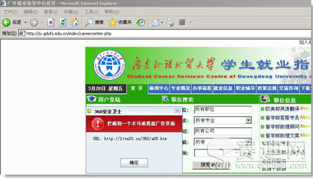 另一个值得关注的被“挂马”网站是广东外语外贸大学就业指导中心网站。当前就业问题已成为热点,每天都有大批年轻学子会访问各种与就业、招聘的网站。因此,黑客也把罪恶之手伸向了毕业生常去的就业类网站。