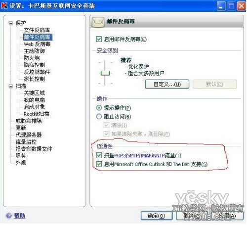 第二步、点击邮件反病毒设置按钮。在电子邮件标签中,将不必要监控去掉,如图所示。这样将只扫描接收的电子邮件。