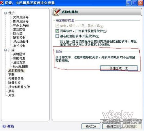 第五步、出现威胁和排除扫描界面,点击“信任区域”按钮。