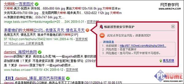 下面是具有“搜索引擎保护”功能的畅游巡警在搜索时的表现:在百度搜索框中输入:damimi,首页的第三个链接即被畅游巡警识别到存在高风险(如图1):