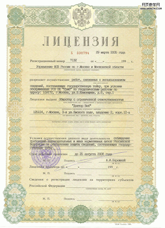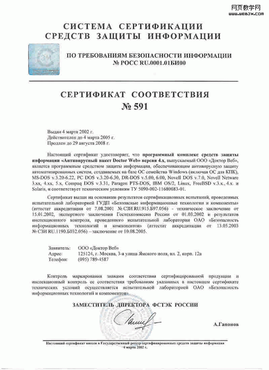俄罗斯国防部颁发给Dr.Web大蜘蛛杀毒软件的证书防(2)