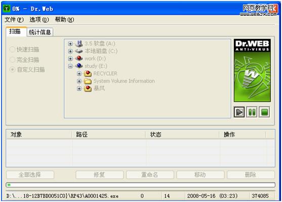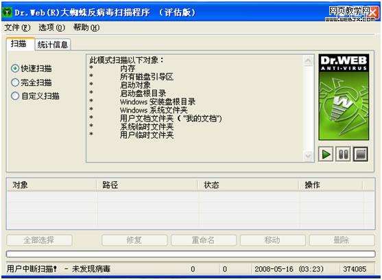 通过图上我们发现了扫描的主界面。这时是系统默认的设置,是最优化的。根据主界面的显示,有三种扫描方式供我们选择。快速扫描 完全扫描 自定义扫描。最右边是大蜘蛛图标和开始,暂停,停止按钮。