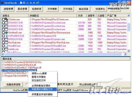 另外最后一种颜色紫色,也代表的是系统进程,不过与其黑色代表不同的是,它有第三方程序加载在其中,比如DLL文件或其他驱动程序,因此这类进程很有可能被黑客所利用。要想知道某进程加载危险文件的位置,只要勾选下面“模块简洁显示”复选框,选择“紫色进程”的名称,此时模块信息内,所出现红色文件的位置,就是存在危险的加载文件。如果你无法判断它们是不是木马,可以通过在“模块信息”窗口内,右键点击危险文件名,选择“使用Goole搜索”选项,来查阅其文件相关资料进行识别。当然也许你能无需查阅资料,便知它是木马,可直接右键该DLL模块文件,选择“卸载模块并删除文件”选项(如图2),
