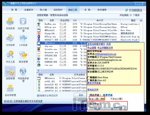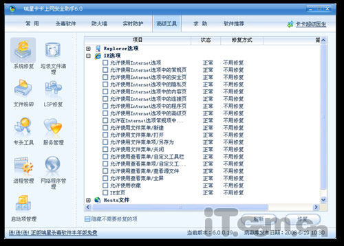针对熟练电脑用户,卡卡上网安全助手6.0提供了全面的实用功能:垃圾文件清理、系统启动项管理、服务管理、联网程序管理、LSP修复、文件粉碎和专杀工具。