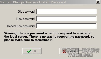 然后会出现如图7的界面。因为是第一次使用,所以是没有密码的,也就是说原来的密码为空。不用在old password里输入字符,直接在下面的New password和Repeat new password里输入同样的密码再点OK就可以了。这里建议设置一个足够复杂的密码,以防止别人暴力破解。自己记不得也没有关系,只要把ServUDaemon.ini里的LocalSetupPassword=这一行清除并保存,再次运行ServUAdmin.exe就不会提示你输入密码登录了。