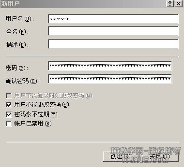 首先建立一个WINDOWS账号SSER,密码也需要足够的复杂。密码要记住,如果记不住就暂时保存在一个文件里,一会儿还要用到。(见图8)