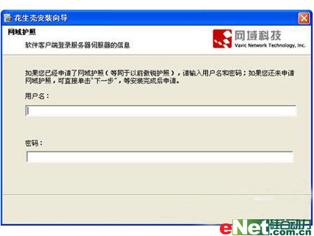 即花生壳客户端,下载:http://www.oray.net/Products/PeanutHull_Support.asp。下载完成后同样按提示安装,在到如下图的步骤时,请输入我们刚才在网站上注册的帐户及密码。
