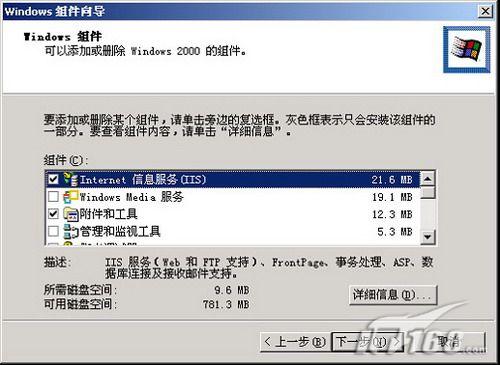 1. IIS安装,可按照“开始”——>“设置”——>“控制面板”——>“添加/删除程序”,打开“添加/删除程序”对话框,选中“添加/删除Windows组件”出现如下图