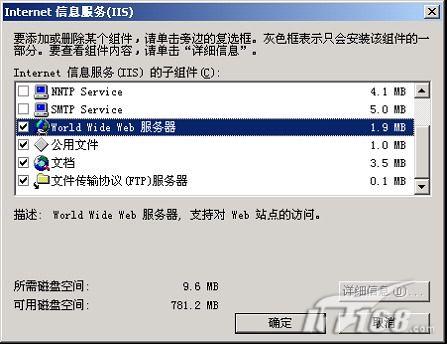 3. 选中图2中的“文件传输协议(FTP)服务器”项后,单击确定,接下来按照向导至安装完成。