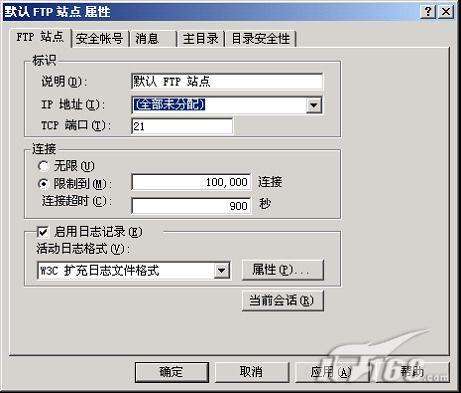 5. 单击“默认FTP站点”,在右键快捷菜单中选中“属性”,打开“默认FTP站点属性”对话框,如图4