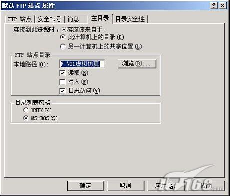 9. 在“主目录”选项卡中选择FTP服务器向外提供服务的主目录,此处可选择“此计算机上的目录”,通过浏览进行选择,或者选择“另一计算机上的共享位置”,这是FTP服务器向外提供服务的主目录就在其他主机上,格式为“\\{服务器}\{共享名}”,在FTP站点目录下的“读取”、“写入”、“日志访问”对FTP站点的权限进行配置,如在此处,我们出于安全考虑为匿名anonymous用户通过分配“读取”而不分配“写入”如图9所示