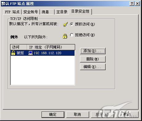 10. 在“目录安全性”选项卡中对FTP服务器的访问控制权限进行分配,可通过此处将FTP服务器的访问权限授权给某部分IP用户或者拒绝来自某些IP用户的访问。注意当选择了“授权访问”后,在下表中的IP地址将被拒绝,如选择“拒绝访问”,下表中的IP地址用户将被授权。如图10