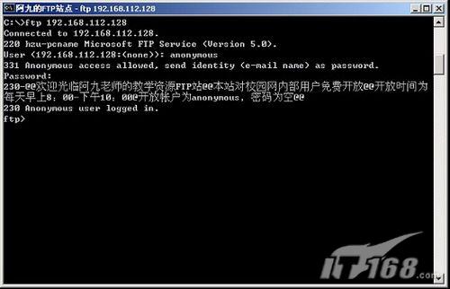 1. 打开“开始”——>“程序”——>“附件”——>“ 命令提示符”,在光标处输入“FTP 192.168.112.128”,如图11