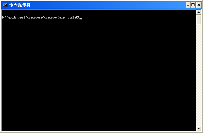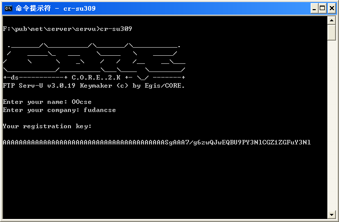 1.首先安装ServU(如果已经安装好了,可直接跳至第二步),可从ftp://10.83.34.33/pub/net/server/servu中找到相关软件,安装基本上是按部就班,由于是共享软件,有一定使用期限,可使用crack,使用方法:下载相关软件(cr-su309.exe),在dos或cmd下找到这个文件的目录,输入cr-su309,如图所示: