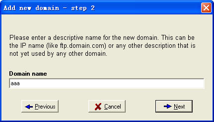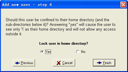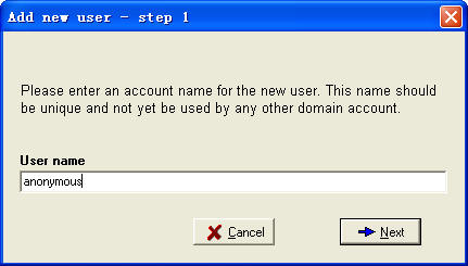 在刚才建立的域(aaa),Users——〉New User,在New之前最好在某个分区的根目录下建一个User目录,存放各用户主目录,比如我在g盘建了一个User目录,并在里面建了一个anonymous目录,然后就可以New了,先输入User name (用户名,anonymous为默认匿名,跳过了第二步设置密码)
